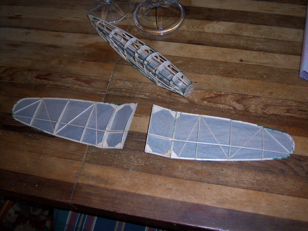 Heinkle re-do. The original wing ribs were so "punky" that shrinking the tissue compressed them into "S" curves giving warps that could not be steamed out. The model was unflyable. There were some other weakness in the fuselags, part because of the soft wood and part because of the design, even after I added some reinforcement. I tore the coveing off and did some re-engineering with stronger wood. The model is now going back together, warp free, and stronger, but seems. from weighing the components, to have only gained a couple of grams. Weather premitting, flight tests next week.