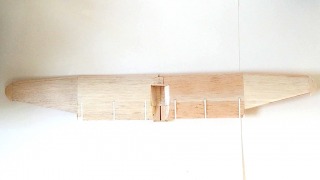 Working on the wing. Top view. White strips wings are the tracks for the Fowler Flaps. Center cavity formed to the same shape as the fuse for the cockpit.