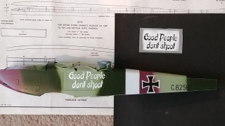 | edtherenderman | Guillows Series 200 - Rumpler C5 | Build | 29-Aug-21 21:54 |  | | Views : 3120 | | I found the “Good People Don’t Shoot” script when researching the Rumpler C4 on Wingnutwings.com. Instead of trying to create a decal for this, I created a stencil in Blender, which I then 3D printed. I had to do a little touch-up but was pretty easy. You will also see zig-zag lacing on the fuse sides. This aircraft had canvas side panels that could be opened on the ground by removing this lacing that held it in place. Interesting detail that I though really adds to the realism. I used ABS material extruded from my 3D printer. |