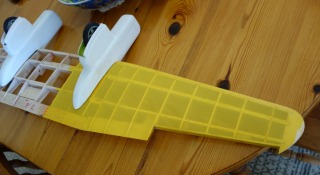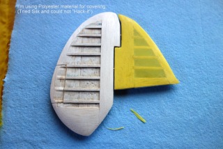 First lower surface now covered in the polyester material. It is strong and dried out wrinkle-free. Took a while but pleased that I can use this covering material - it has been in my model store for about30 years!!!!