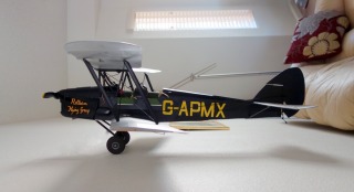 Tiger Moth G-APMX is now back on wall - in flying attitude. Notice the safety harness's blowing back in the slip-stream!