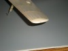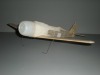| The landing gear wire is in place and the tail feathers and wing are tacked in place with masking tape. |