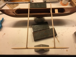 The outrigger added.All the wood received several layers of Minwax Polyurethane with lots of sanding in between coats. Final sanding was 600 and 1000 grit paper with a final buff coat of a paper towel, which gives the wood a nice soft sheen. Not too glossy.