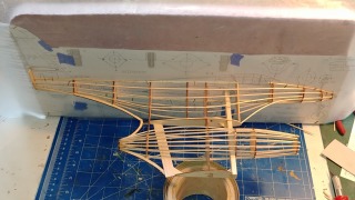 Now that the Hannover is complete, time to start something REALLY different; a McDonnell XP-67 MoonBat. This is not a very well-known aircraft. Only one example was completed and after flight tests, was found to not be significantly better than other aircraft at the time. Part of the problem was it was being used as a test bed for a new engine being developed by Continental. The engine didn’t develop the power expected, and the aircraft design had a lot of overheating problems. An example of trying to do too much at one time. Plus, the aircraft didn’t have the stability one would want in a gun platform, pilot visibility around the engines was poor and ground handling was difficult because the pilot couldn’t see the wingtips. BTW – if you like old, weird machines, try out the https://oldmachine press.com. I love this site! I found a plan for the aircraft on Oz. They are for a 60” R/C so I scaled them down to 1:24 which gave me a wingspan of 27.5 inches. I then converted them so that I could cut the parts on my 2D Laser etcher/cutter. It took a couple of evenings to convert the plans and about 4 hours to cut. I use almost an entire 6” x 36” sheet of 1/16” balsa. Over the 4th of July weekend, I started assembly. This picture is one side on the board. This is a pretty complex aircraft shape and I found that I needed to add a new former and a lot of stringers because trying to “skin” something at this scale will be more complex than the original 60” version.