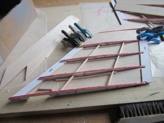 | Don C | Scratch Built Douglas F4D Skyray | Build | 26-May-20 11:58 |  | | Views : 626 | | I like the design of the wing construction. The ribs are split in the middle alowing for a half to be constructed flat on the plan. Then you simply glue the other half of the ribs in place. No shimming or guessing. Given that, I am trying something different for the infill: one 3/32 strip between each seyt of ribs. On this one the bottom is done. As the camber increases it takes shimming which you can see, but it giges just the right surface. I used the 3/32 so there was enough to sand some off. We shall see. |