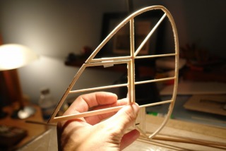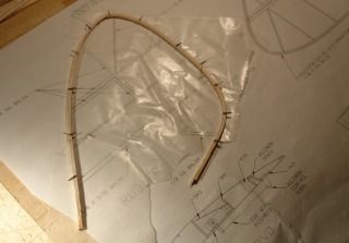 After soaking the two strips for 15 minutes in water, they are taped to the foam guide, thin CA applied, and heated in a microwave oven for 12 seconds. Once removed, they retain the shape of the guide, and are pinned to the plans.