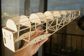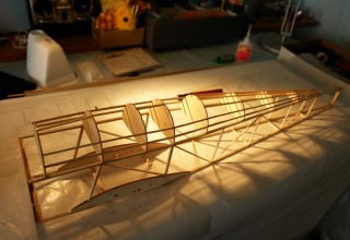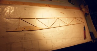 The start of the build. All 1/8 sq balsa, pinned to the fuse side plan.