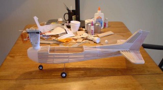 Fin built up, rudder core taped on. Main wheels are wood! They will be replaced. It's a bit tail heavy. Duh!