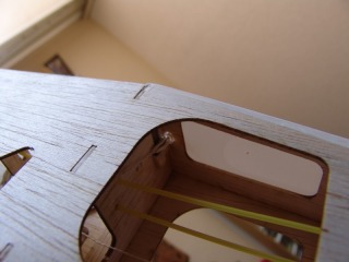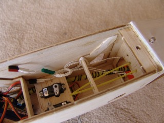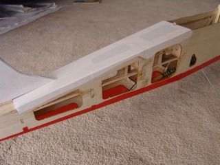 Fuselage navigation lights in place, balsa stringers added to allow covering join in center of fuse.