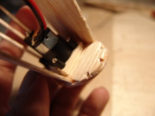 Detail of the installation of the LPS drive unit. One piece of lite ply was CA'd to the bulkhead, and the second is a spacer (not glued). The motor is then screwed to the CA'd lite ply piece using the bottom two screws only. The top just has spacers (no s