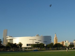 P-38 in Bicentennial Park, Miami. American Airlines arena and the Freedom Tower in the background.