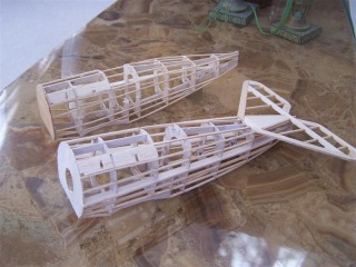 All new 1/16" formers and 3/32" stringers on fuse . Stabe is all recut 3/32" material. Will sand and use some 1/32" sheeting and silkspan.