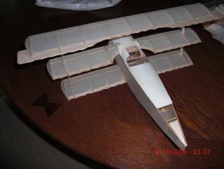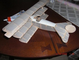 Really looking good till it fell off the table and all the wing supports were destroyed. All the repairs went well and she's waiting fo a few coats of clear dope.