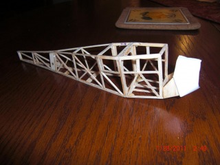 Fuselage completed. Needs some struts for the windshield and a radial nine cylinder. I doubled the longerons at the fuselage base and used 1/16 X 1/8 instead of the nice soft Dumas balsa. This is a hanger, not a flyer so beefed it up a tad to help with the tissue.
