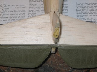 Rudder hinge pivots. Pin is piano wire inserted from top of rudder and inset to balsa frame. Control surfaces are tissue covered.