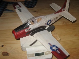 | John Cooper | Guillows Series 900 - Trojan | Parked | 14-Sep-09 22:38 |  | | Views : 2790 | | Completed and weighing 14.0g without rubber. I had to make a balsa prop, because the platic one I was going to use made the plane too nose heavy. The plane is trimming really well, like the other 900 series kits I have built. It was quite easy to get it to circle a large gym twice for abouit a 25 sec flight. |