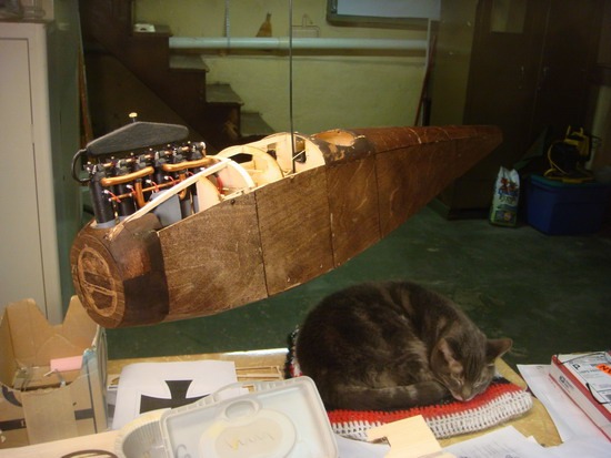 The fuse is sheeted and stained. Egine must be lowered so the rear intake manifold is even or slightly below the curved fuse stringer. Top front cannot be covered until I fabricate the MGs.