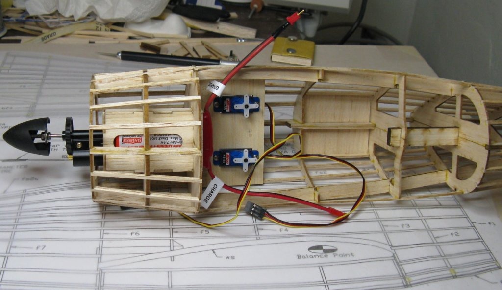 Fuselage with motor, battery, and a pair of servos. Weight is already at 118.3 grams (4.17 oz).