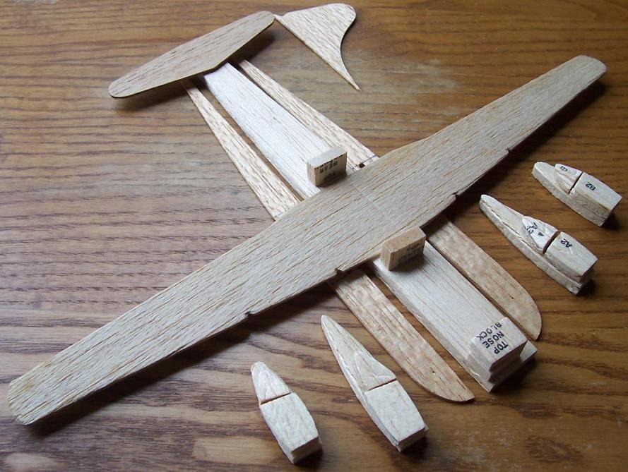 Balsa parts supplied in the kit for the B-29. minus the landing gear parts and turrets.