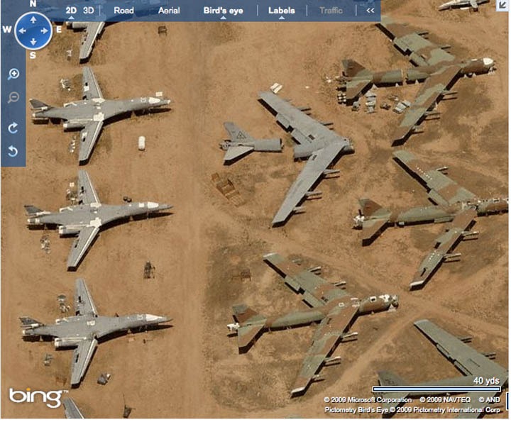 | Luke War | 26-Aug-09 22:31 | | Go to that website and search for Davis-Monthan AFB, Tucson, Arizona. You'll have to do some searching until you find it in the city, but once you do zoom in until the "Birds Eye" button is usable. It's a pretty unique angle of the Boneyard. Dont forget to use the rotate buttons on the left for some different views!! |