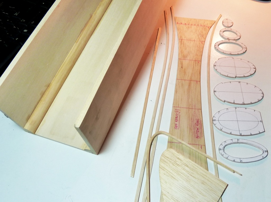 Laminated top, bottom and side Keels with 1/32" Bass/Balsa/Bass/ Balsa. Vert stab profile is all Bass (to be sanded to taper thickness). Formers to be notched only at Keel junctures. I'm going to try building the fuselage on a "Jig". Never done it before. Something new for me.