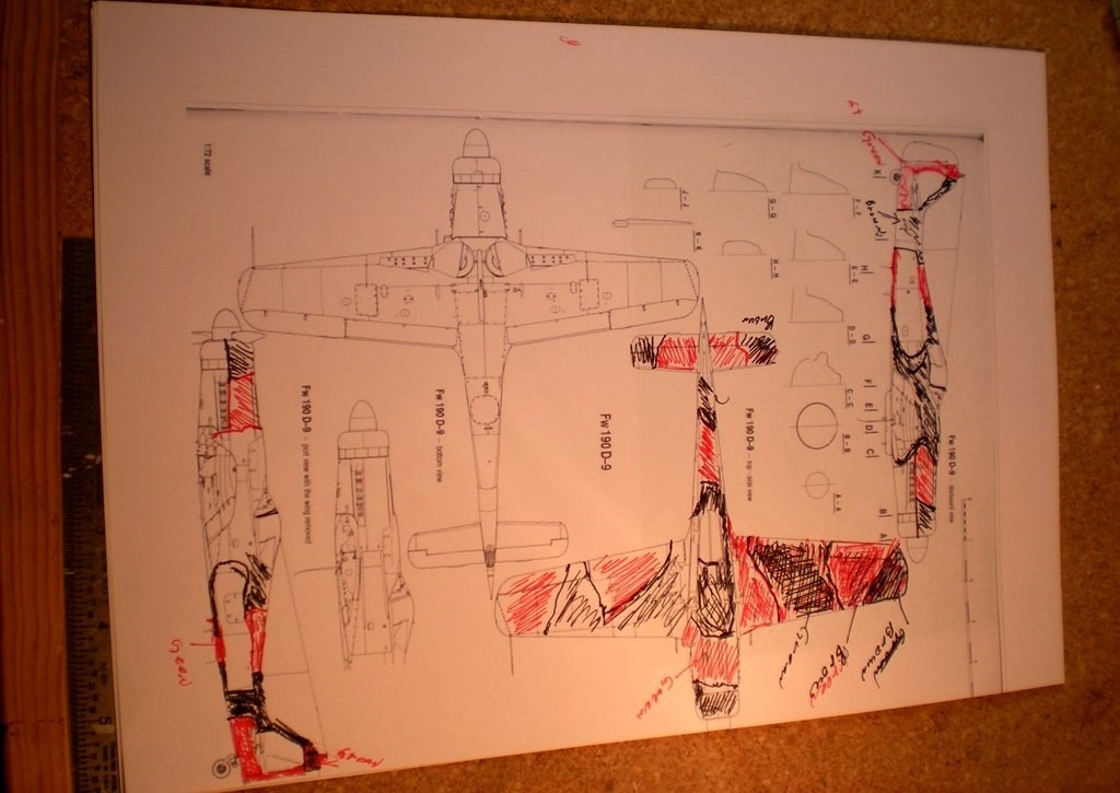 In order to ease painting Rudel's D-9 I printed out a 4 view and colored in a map of the colors creating a map to airbrush by.