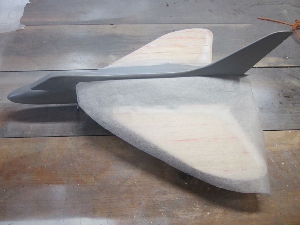 The joint smoothed out quite easily. After 3 coats of Thinned dope and a 32 sanding it's time to cover.Got boath top sides done, doped and sanded. Botoms next.