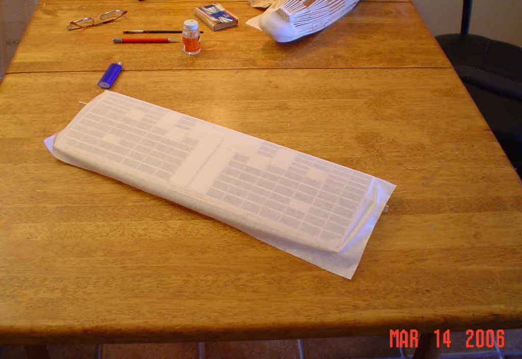 Bottom of the wing covered and waiting to be trimmed. The extra wood will support the wing at the center, provide a solid base to attach the plastic engines, and the others are where the struts will be glued.
