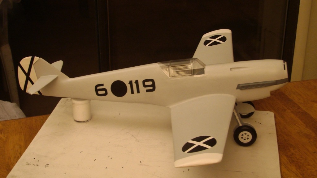 | Nearly. They were in the natural aluminum with yellow and red roundels and the same black X on a white background on the rudder. This 109 is painted with just black and white, and mixtures thereof, and unlike the FW-190, no silver is being used. |