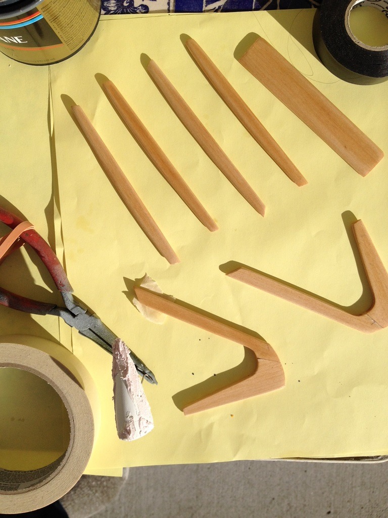 Landing gears and struts during the early build. Used basswood with several coats of varnish. That white "thangy{ being held by the needle nose pliers is the rough shape of the pilot's head rest.