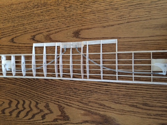 Cable-type pushrods allow flexible connections from the control stick to the aileron bellcranks. Holes in the wing ribs were made with a leather punch. Crimp eyes allow the cable ends to be screwed to the stick ball joint.