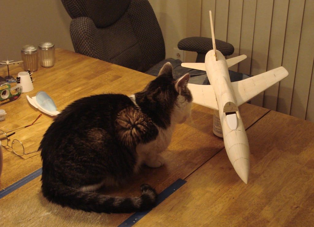 That's a good cat! We have 4 adult cats that are well behaved around my planes and now a 4 month old kitten that attacks all that moves or looks interesting; makes building a challenge right now!