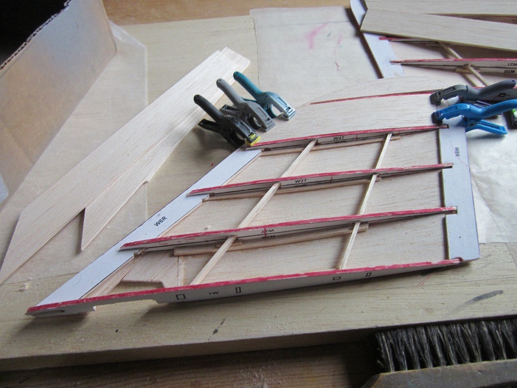 | Don C | 26-May-20 11:58 | | I like the design of the wing construction. The ribs are split in the middle alowing for a half to be constructed flat on the plan. Then you simply glue the other half of the ribs in place. No shimming or guessing. Given that, I am trying something different for the infill: one 3/32 strip between each seyt of ribs. On this one the bottom is done. As the camber increases it takes shimming which you can see, but it giges just the right surface. I used the 3/32 so there was enough to sand some off. We shall see. |