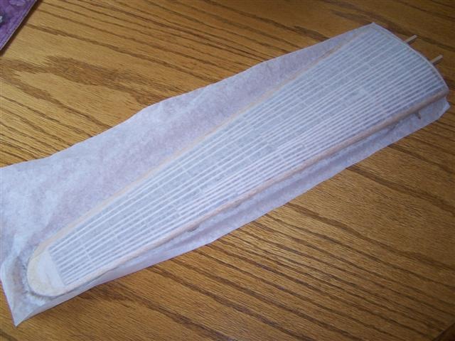One piece wet SGM tissue applied. Used dope to seal balsa, white glue to attach silkspan and dope for sealing tissue.