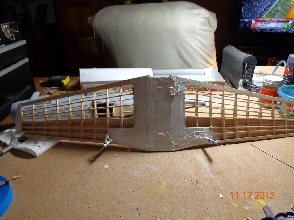 Bottom of wing planked and ready for sanding of second coat of filler. Landing gear in progress.
