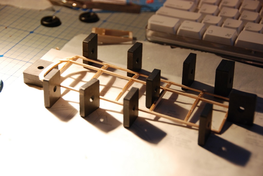 Wing panel getting the correct dihedral added on the root rib. The magnet board is great for aligning everything, and holding things without pins.