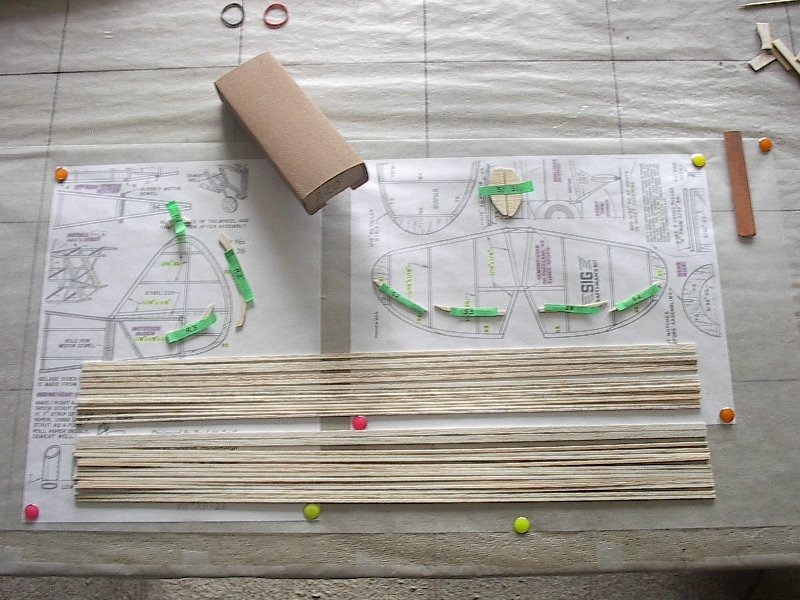 22" Sig "Customaire" - Spent the day so far, photocopying sections of the plan, and light sanding (220 grit) all of the fuzz off of all of the sides of the "saw cut" stringers - 3/32" sq, 1/16"sq, 3/16" X 3/32", and 1/16" X 1/8" stripwood. After blowing off all of the sanding dust, I dragged each piece through my black cloth T-shirt, and I was amazed at how much sanding sawdust was still actually left on the wood. These laser-cut parts in this kit, don't seem to be as "laser-burned" that very dark brown color on the edges, as on other kits. I have heard that the way to get around that (from Dave Paul Cowell, I think), is to laser cut over glass. Anybody hear that before? I'm ready to start gluing now that all of my balsa is squeaky clean ...