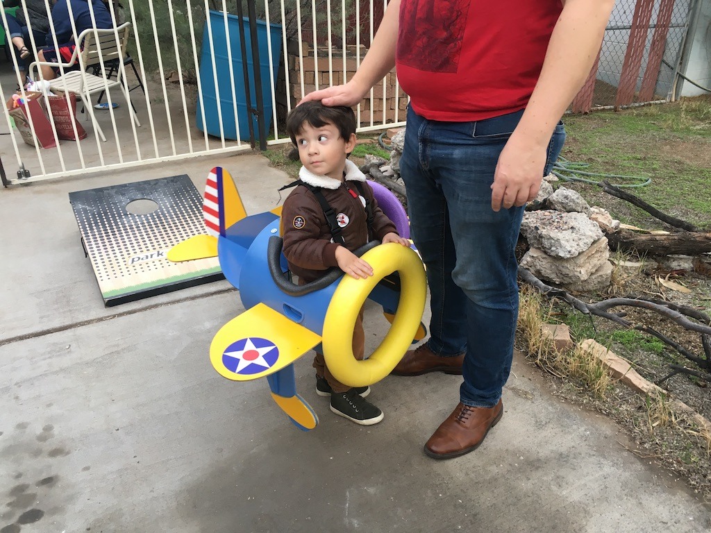Wearing his flight jacket. (also supplied by Grandma and Grandpa)