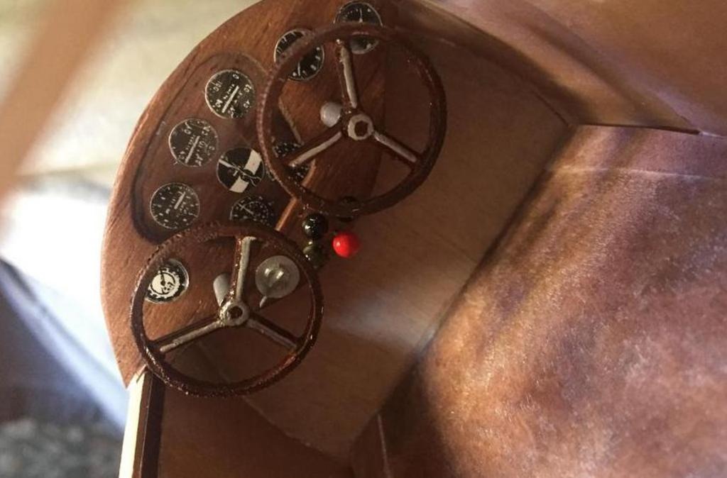 | heywooood | 17-Aug-17 10:33 | | control wheels fabricated from slicing a plastic bottle top with a razor knife, the hub and spokes are 1/8" dia. wood dowel for the hub and sanded toothpick sections for the spokes. The columns are aluminum tubing. I still need to add bezels and placards etc..also rudder pedals and so on |
