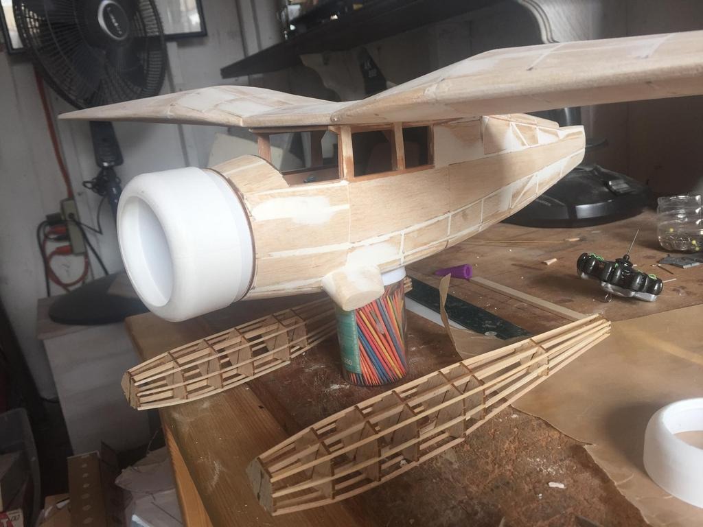 | heywooood | 23-Sep-17 17:13 | | so - the cowling. The kit provided formed cowling was just a bit too small in dia. to work with the engine I had decided to work with so I modified things a bit. In this image you can see the cowling I used mounted over the sleeve of plastic sheeting provided with the kit that you are required to cut and fashion into a ring and mount to the forward fuselage. The engine fits neatly into the ring sleeve and then my cowling just fits over the sleeve...my cowling is cut from the bottom of an aspirin bottle that I emptied trying to figure out how to make this work... |