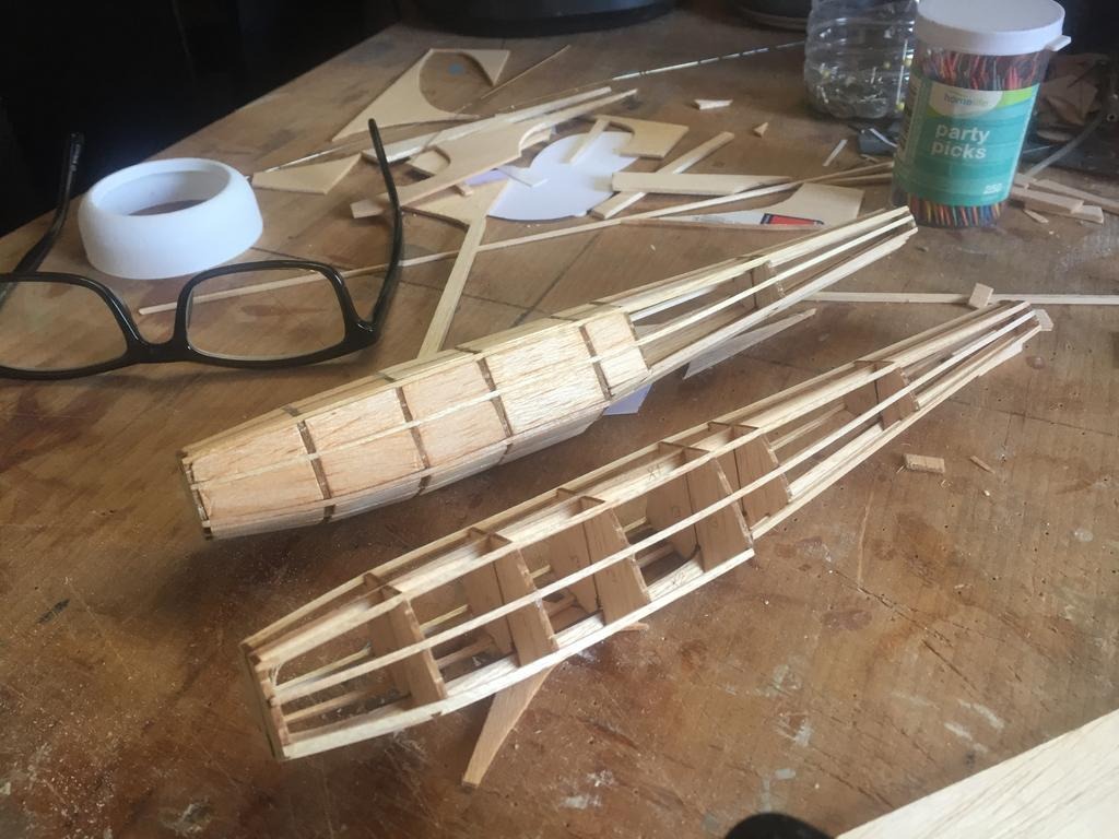 | heywooood | 23-Sep-17 17:16 | | these are the Guillows floats I had from a previous kit that I decided to put wheels on instead. They are a tad undersized for this larger scale Stinson so I am going to do a little surgery on them once the infill is complete..I plan to add a one inch thick balsa block at the step and then skin the top and sides with 1/32" thick birch ply |