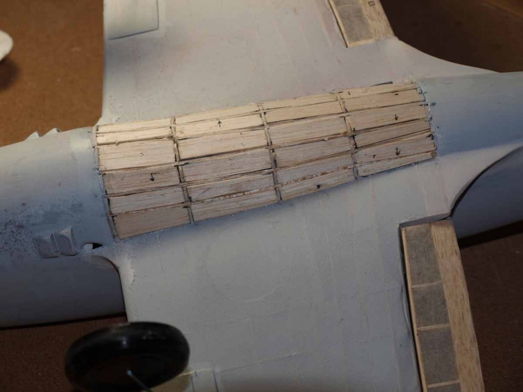 Wing bottom planked and ready for finishing. If you look closely you can just see the wheel wells - covered now but will cut when ready to paint inside.