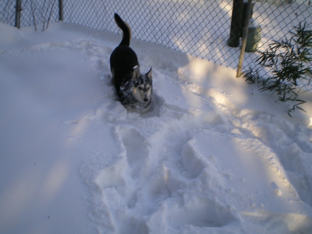 dozer dog playing in the snow.