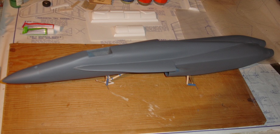 Fuselage not covered with silkspan. 3 coats primer, sanding between each.