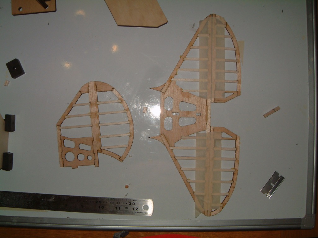 Tail and fin are not sheeted. Although timber included laser cut spars they were no good as once lasersed they were 1/16" too narrow.