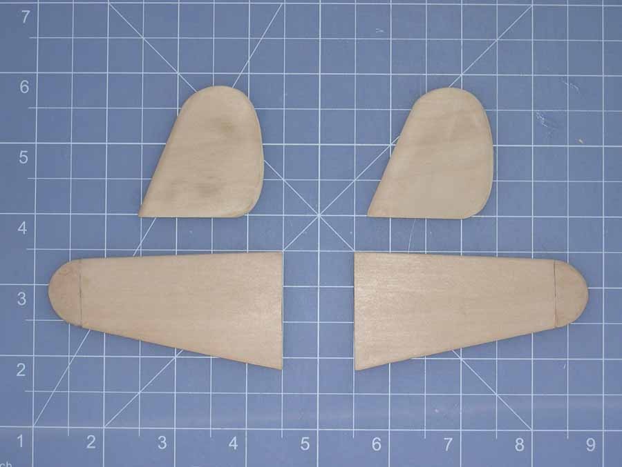 Cut and shaped the elevators and rudders. Elevs are two piece wrapped, rudders are three sheets of basswood pressed together. Basswood sure takes awhile to sand, but it looks good when its done!