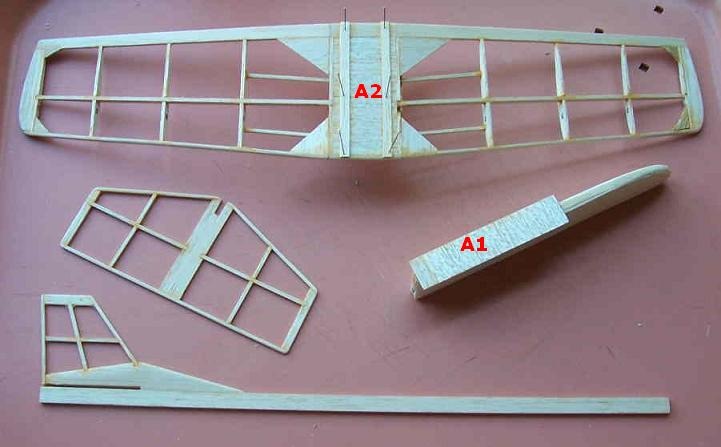 The Jr. Cloudbuster is quickly coming together. Wing platform A1 and spacing strips A2 are glued in place.