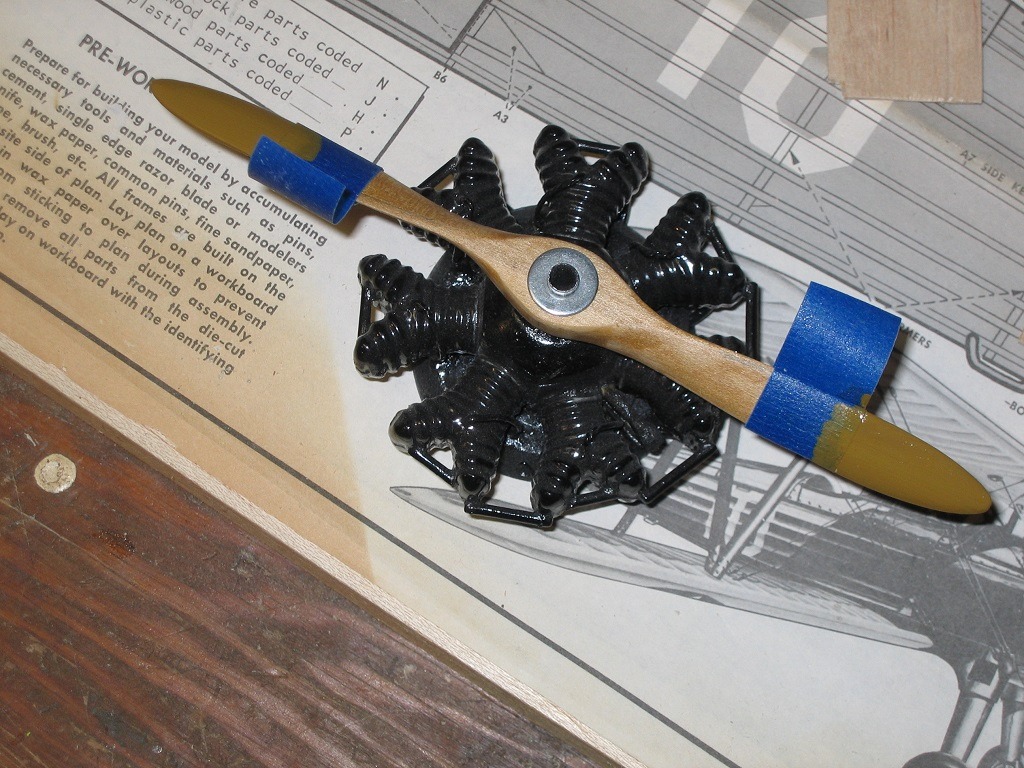 Used balsa for engine block and the plastic cylinders from kit. Used a Testors clear flat spray and it looks much better. Washer is press fit onan aluminum tube to hold prop. Yes it spins.