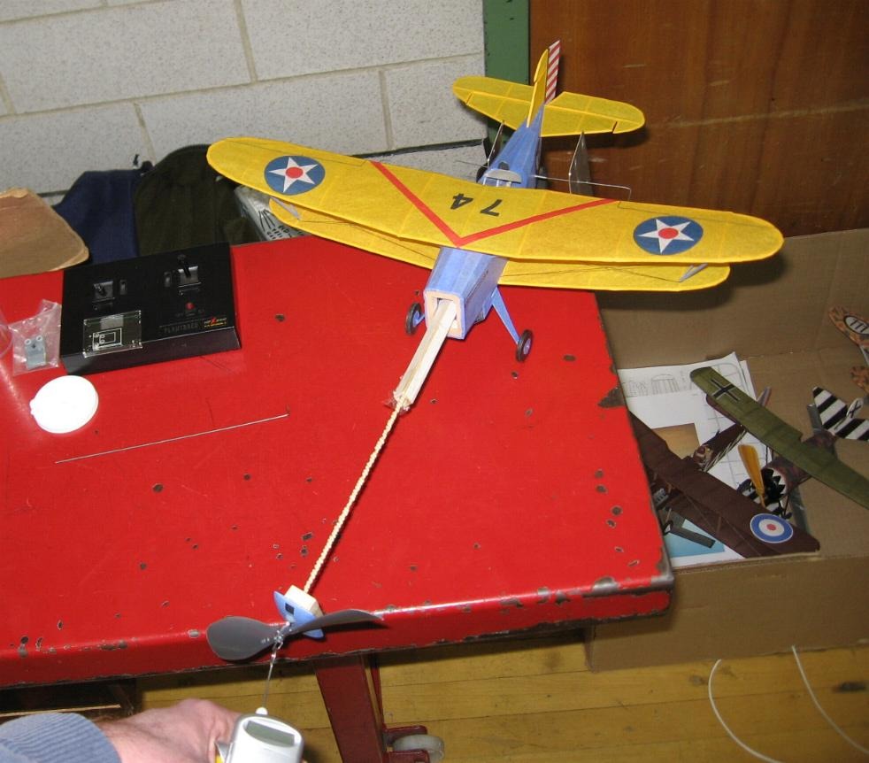 | John Cooper | 11-Feb-08 23:03 | | The rubber is stretch wound to about 600 turns. Note the balsa wood blast tube to protect the fuselage from a possible break in the rubber. |