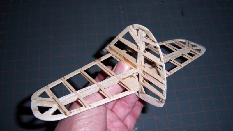 | hjlittman | 25-Feb-08 14:43 | | The ribs are 1/32 inch stock, The center rib, the ribs where the bracing struts attach, and the ribs on either side of break line at the top of the fin have 1/32 webs in them forward of the hinge line, while the rest are hollow. The spars are 3/16 inch square, hard balsa to take the hinge wires. There is 1/32 stock laid on top of the spars between the ribs to keep the whole thing flush. The outlines are 1/16 inch stock except for the stabilizer tips, the bottom of the rudder and the filler rib at the stabilizer/rudder joint which are 3/32 inch stock. When covering, the tissue is attached to the spars on both side of the break line as well as the outlines, After the covering is sealed, but before painting the ribs and covering are cut through at the hinge break line to separate the surfaces and the hinges are installed. I started doing this on smaller models where it was easier to cover a whole elevator or tail than a small control surface. With a model this size it may be a moot point, but it does make it less likely that the elevator and rudder will warp when being covered. On smaller models, without movable surfaces, I sometimes do the tails this way but make the airfoil flat on the left side and cambered on the right as a way to build in a torque adjustment and force a right glide power off. |